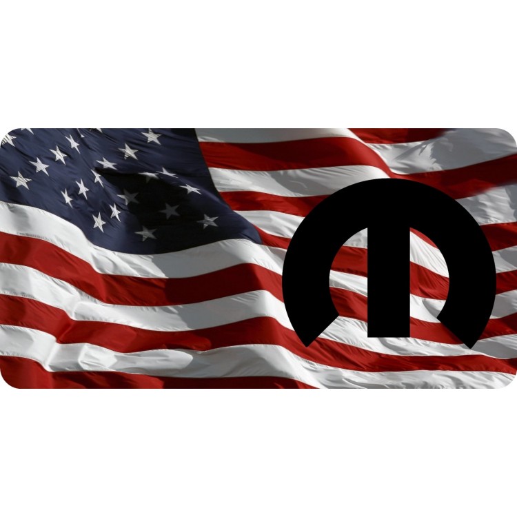 Mopar Emblem On Wavy U.S. Flag Photo License Plate